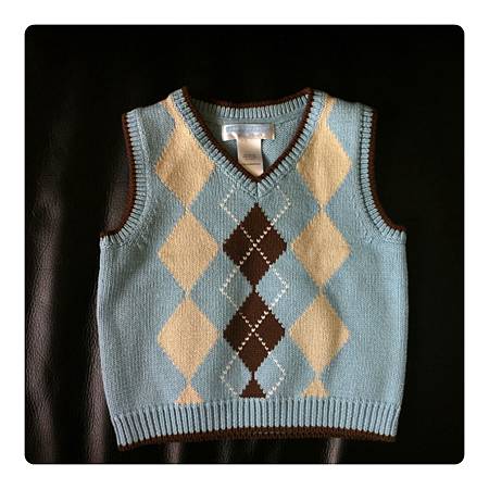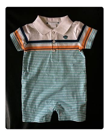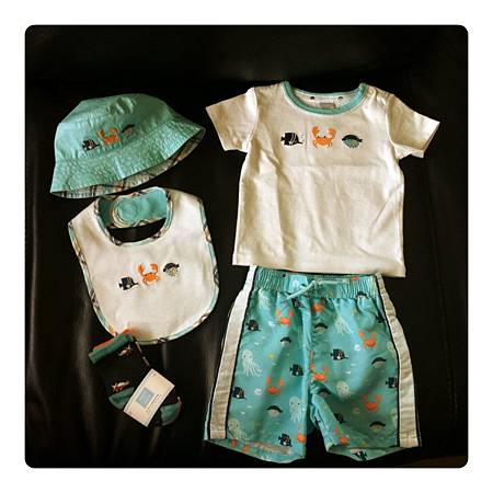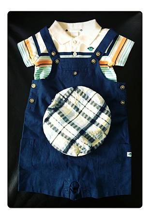 昨天本人隨性臨時起意地買了第一件給小咖哩的衣服,今天週末P先生跟我在家裡附近的town center亂晃,想說他昨天沒有參與到,所以今天剛好可以帶他去見識一下賣童裝的店,於是走進跟昨天同一家但不同分店的Janie and Jack,由於之後他還要去剪頭髮,所以我們也想說就進去看看了解一下就好!!!進到店裡直接走到最後面的sale區(這是我們的習慣,尤其是衣服類都是從有折扣的開始看,錢要花在機票跟旅行上~哈哈),然後翻一翻看一看他就拿了以下這些(如圖)給我看(我心想要在折扣區找到同一系列還配成一套,真有你的啊!!!!)看了一下SIZE都是六個月以下的,我問他你確定都要嗎?baby都長很快耶!!!而且據我研究結果,baby那麼小時很多都是穿一件式整套的,穿脫方便又保暖,他說叫我自行決定,還叫我慢慢看如果要買其它的就最後再一起結帳,然後他就得去赴剪頭髮的約了!!!我後來就再逛了一下,挑了一些,還在猶豫要不要結P先生選的上下身那套,後來決定還是買下來,可能會有點不實穿,也可能穿不了很多次,但一想到這是他第一次幫小咖哩選的衣服,還一套哩!!!覺得非常有意義,而且至少可以穿一次照相留念吧???所以二話不說還是給它買下去!!!說真的,我也覺得很可愛啦,非常有陽光沙灘男兒的氣息~哈哈!!!!不過我只能說男生買東西真的快狠準,這是我們女生學也學不來學也學不會的技巧啊!!!!另外,背心毛衣也是在選購過程中,P先生說:”背心也來一件,滿好看的!!!!”他很少會主動說要買東西,對自己都很省,所以既然他開口又是幫小咖哩選的,我覺得意義非凡,所以也就拿了一件~我也是覺得還不錯!!!!而吊帶褲及裡面配的就是自己亂配的,對於baby boy下半身不是褲子就是吊袋褲的變化了,加上一頂鴨舌帽,有沒有超像騎腳踏車要去送報紙還是送牛奶的?!!!!哈哈….(既使是男孩,也要把他當玩芭比娃娃玩:p)