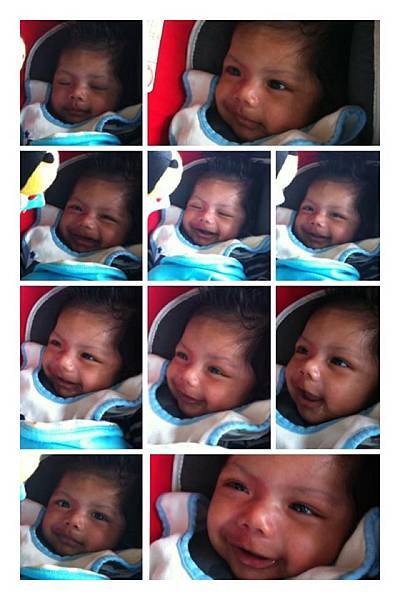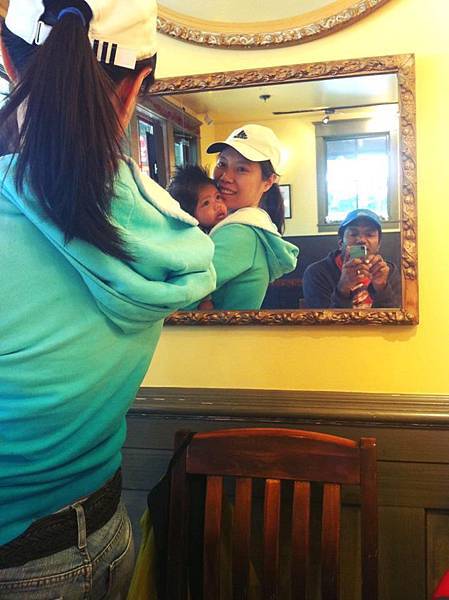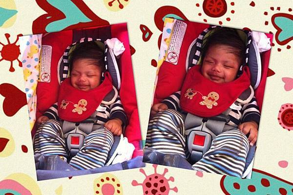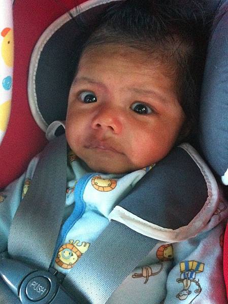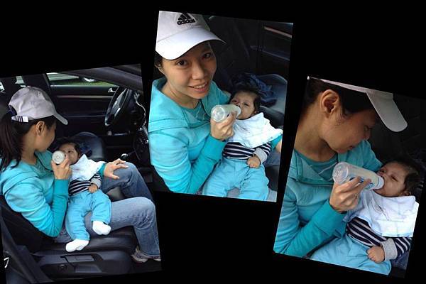馬麻在車上餵我喝奶..咦~我們今天母子裝同色系耶:)