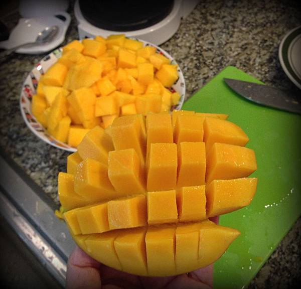 我好愛芒果,以前小時候想吃芒果就跟媽媽說一聲,接著丁狀芒果就會出現,我們就用叉子一直叉一直吃,根本不用經過啃或棘手階段啊,記得以前媽媽都說切好完整容易吃的部份都留給我們,她就自己站在流理台前啃剩下的部份,沒想到現在自己當了媽媽,也做起同樣的事情啊!